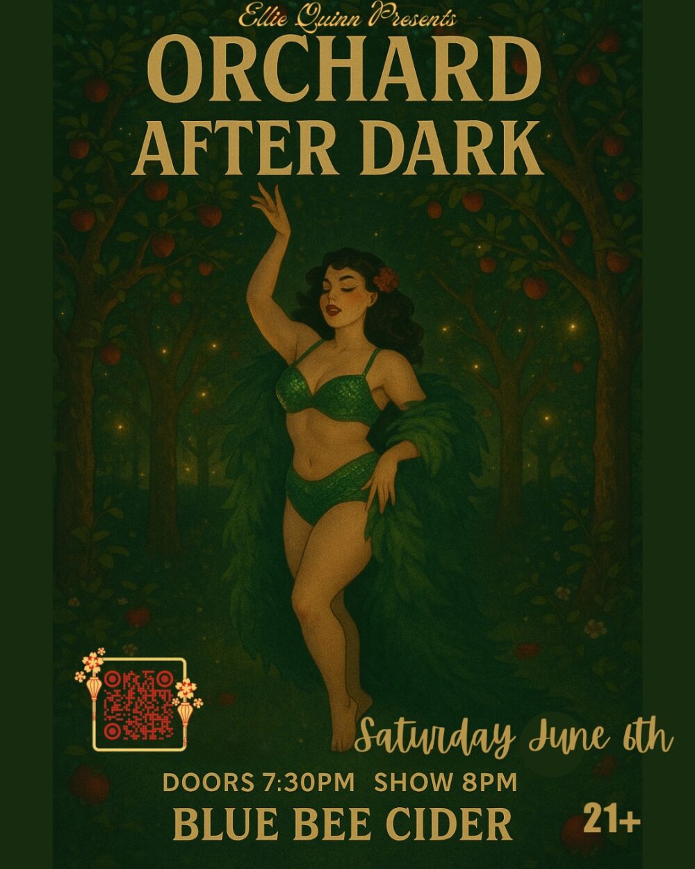 Orchard After Dark is a sultry, whimsical burlesque experience set in an enchanted orchard, where magic blooms and desire lingers in the air. Nestled beneath the twinkle of fairy lights and the boughs of apple trees at Blue Bee Cider, this immersive summer showcase invites you to indulge in fantasy, temptation, and transformation.